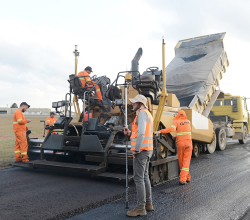 O concreto asfáltico, produzido em usina, é transportado por caminhões até a obra, onde é descarregado no silo de recebimento da vibroacabadora. A máquina tem potência suficiente para empurrar o caminhão durante o trabalho. O sistema rodante do equipamento pode ser de esteiras ou de pneus. Hoje, os modelos de pneus possuem tração o suficiente para empurrar caminhões e operar em aclives.